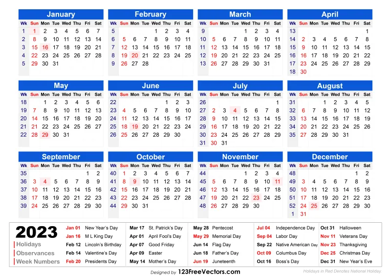 Free 2023 Holiday Calendar With Week Numbers Printable Printable