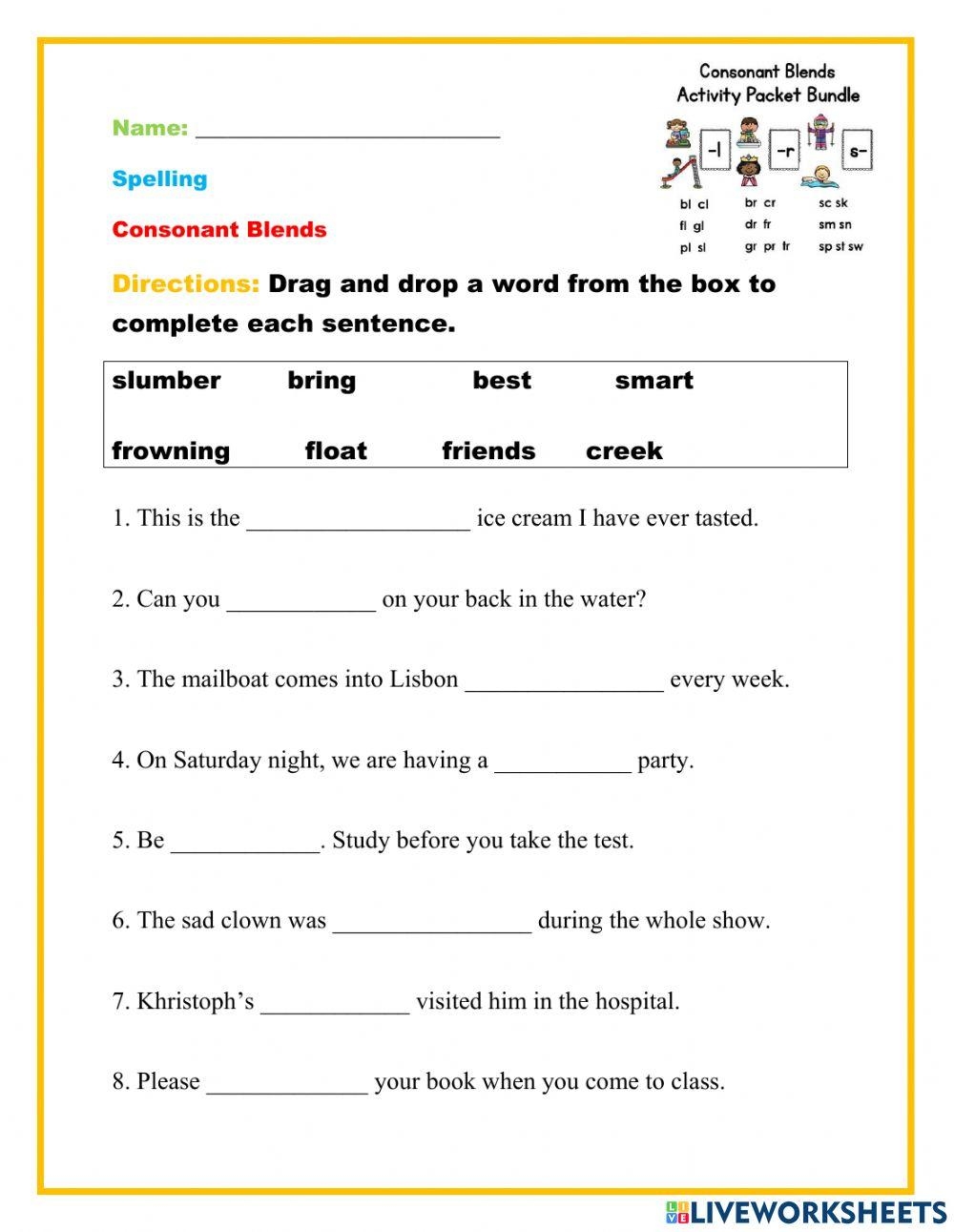 2. Fill in the Blanks: Students fill in the missing consonant blend to complete words.